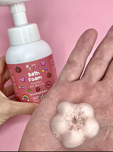 Очищаюча пінка для рук і тіла HiSkin Kids Малина - дуже ніжна, пухнаста, рожева, із солодким ароматом малини.