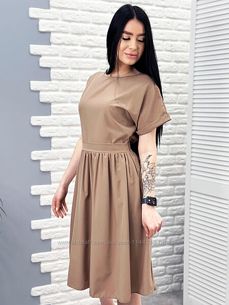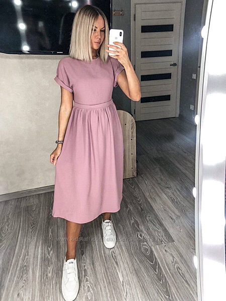 Однотонне плаття міді з короткими рукавами – безпрограшний варіант для літнього сезону. Така модель виглядає однаково красиво як з модельним взуттям на підборах, так і зі спортивним взуттям на низькому ходу.Літня сукня вільного крою з відрізною талією прикрасить будь-яку жіночу фігуру. Особливо вигідно плаття буде виглядати на дівчатах, яким потрібно приховати зайвий обсяг на стегнах. Стильна довжина міді (до середини ікри) додасть образу жіночності і легкої загадковості. Сукня має круглий неглибокий виріз горловини і короткі рукави. Для зручності, в одному з бічних швів є потайна блискавка.