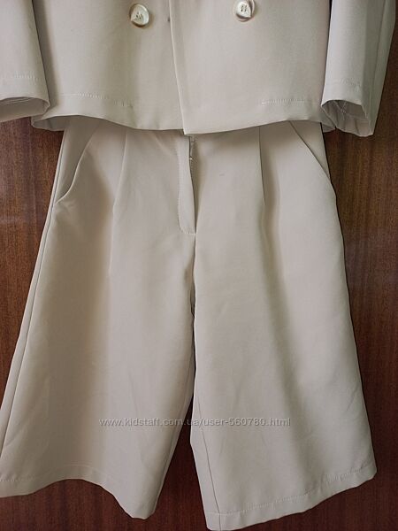 В отличном новом состоянии. Ткань качественная ,приятная к телу,не кашлатится. Красивый благородный бежевый цвет. Выглядит эффектно и стильно. Можно,как на выход и на каждый день-носибельный ,комфортный.Шорты фасон бермуды-длина 60 см