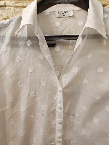 Чудова блуза / сорочка Kaliko, тонкий,трошки прозорий котон в однотонний горошок, рукав 3/4 ,стан ідеальний, без дефектів, Заміри: ПОГ 50 см, довжина по спинці 57 см,плечі 40 см.