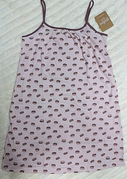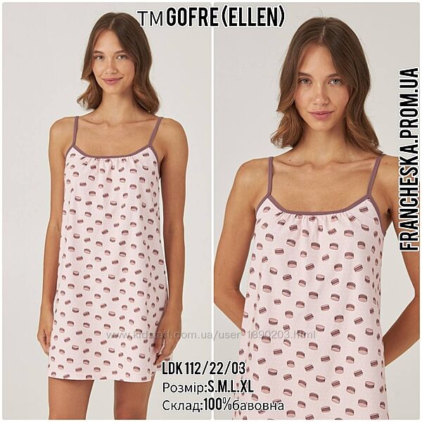 Нічна сорочка жіноча на бретелі (LDK 112/22/03) від українського виробника ТМ Gofre (ELLEN) з колекції "SWEETS".Сорочка нічна виготовлена з м´якої якісної бавовняної тканини з принтом, вільного крою, на тонких не регульованих бретелях, довжиною вище колін. Сорочка дуже зручна та комфортна, відмінний варіант одягу для дому та подарунка коханій та близькій людині.
