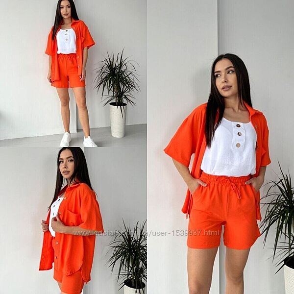 Костюм трійка. Тканина американська креп жатка Розмір 46-48 (Л)Колір оранжевий. Ідеальний костюм Легка сорочка вільного крою. Чудово освіжає образ маєчка білого кольоруПредложения Premium магазинов
