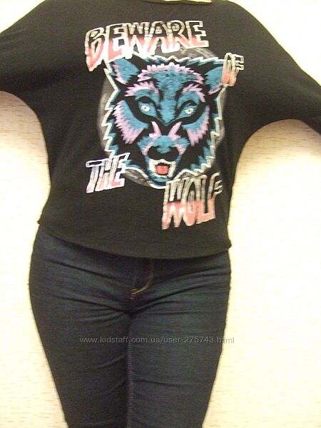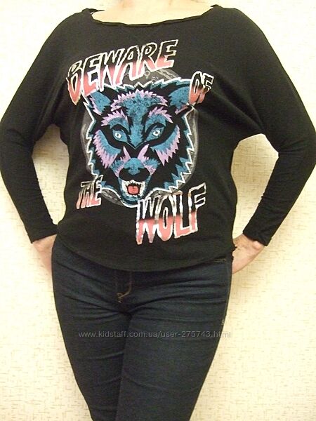 Фасон- летучая мышь, рукав 3/4. Спинка открытая. На груди яркий принт с надписью- Beware of the wolf.