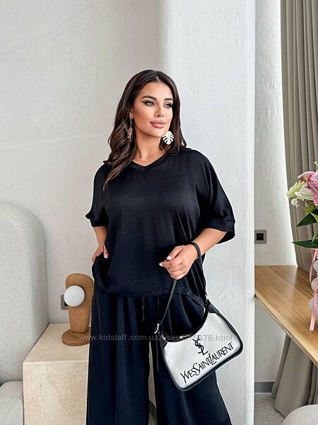 Костюм складається з оверсайз футболки, позаду трохи подовженої, та штанів на високій посадці. Пояс на резинці з куліскою, має бокові кармани.