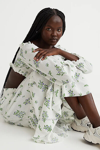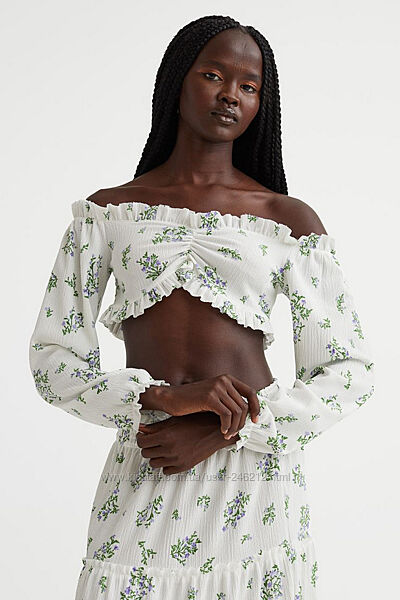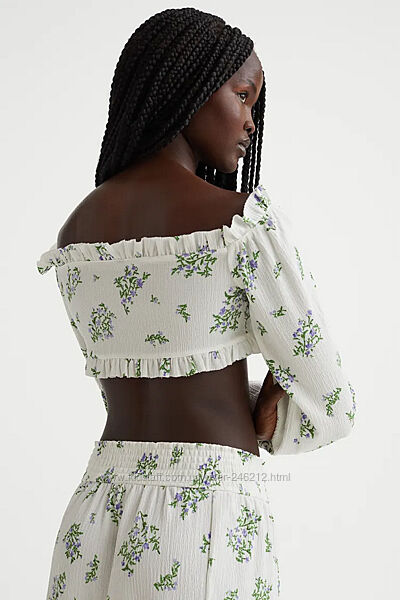 Укорочений топ із відкритими плечима із жатого джерсі із малюнком та довгими рукавами-ліхтариками.