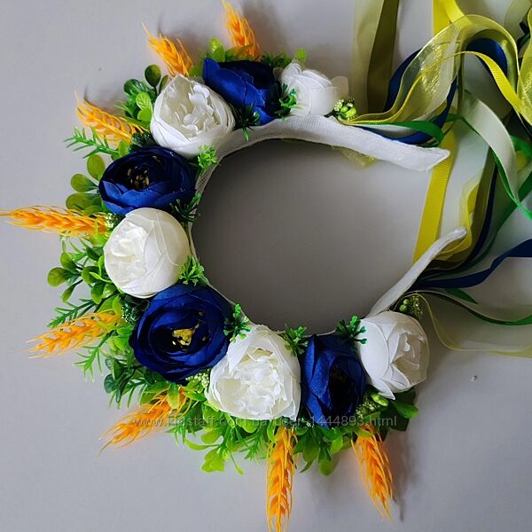 Універсальний варіант під вишиванку з синім візерунком, або білу, синю, жовту сукню. Стрічки не знімаються, мають різну ширину. Віночок прикрашений короною з колосків та зелені. Оздоблений білими та синіми квітами. Опис: - Основа металевий обруч - Якісні штучні квіти з тканини та пластику - Листя, колоски, тичинки – тканина, пластик - Стрічки різної ширини : атлас, репс, шифон Більше фото та відеоогляд в моєму інстаграм gerbera_sunshine Оплата 100% на карту. Відправка в день оплати, якщо оплата здійснена до 18:00 і працює відділення Нової Пошти. При оплаті пізніше - відправка наступного дня - зранку. Відправляю Новою Поштою. Повернення не має. Без накладеного платежу. Робіть покупки усвідомлено.