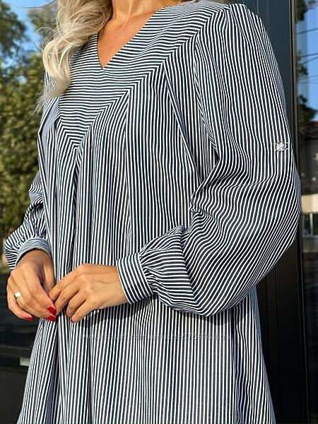Сукня в полоскуСукня вільного крою із натуральної тканини поєднує комфорт та красу, дозволяючи шкірі дихати. Неглибокий v-подібний виріз виділено горизонтальною смужкою. Виріз плавно переходить у вишукані складки по всій лінії грудей, що виділені вертикальною смужкою. Об´ємні рукави на широких манжетах та відсутність лінії талії робить образ легким та повітряним.