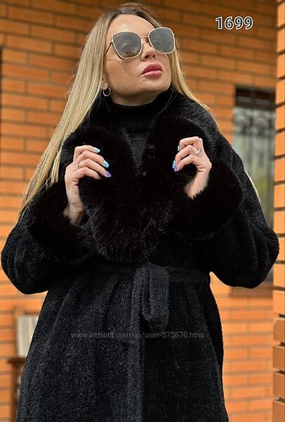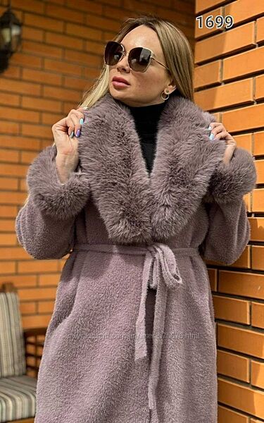 Матеріал дуже еластичний, м´який, але водночас добре тримає форму, не мнутися. Якість супер! Застібка кнопки.Кишені прорізні .Пальто декороване єврохутром (не відстібається)