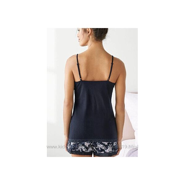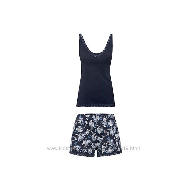Жіноча піжама із бавовни від Німецького бренду Esmara. Складається з майки та трикотажних шортів. Майка з елегантним мереживом на комірі та по нижньому краю, регульованими бретельками. Шорти із зручним еластичним поясом та елегантним мереживом по нижньому краю.Розмір евро L 44\46: