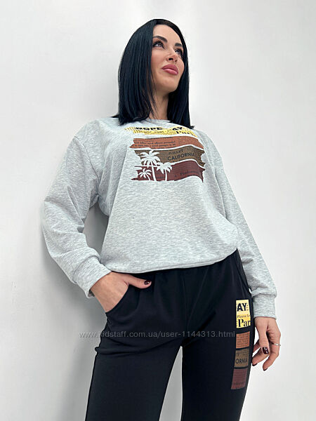 Модель складається з світшота та штанів різних кольорів, що дозволяє створити цікавий повсякденний образ. Завдяки різниці відтінків елементи комплекту легко носити як разом, так і окремо: наприклад, з футболкою та лосинами.Верх костюма – вільний світшот зі спущеною лінією плеча та класичною круглою горловиною. Лаконічний дизайн ідеально поєднується з великою контрастною наклейкою, прикрашеною написами та малюнками. Штани з манжетами внизу забезпечують неперевершений комфорт та надають образу сучасного шарму.