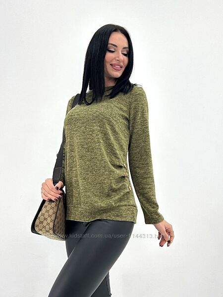 Кофта являє собою класичний джемпер з довгими рукавами та округлою горловиною. Класичний прямий крій робить її універсальним вибором для будь-якого гардеробу. Кокетлива збірка і дерев´яні ґудзики вздовж бокового шва додають образу цікаву деталь і візуально коригують силует, виділяючи талію.М´яка ангора софт, з якої пошита ця модель, — це компроміс між теплими і тонкими тканинами. Завдяки такому рішенню кофтинку можна носити і теплою зимою, і мінливою демісезонною погодою.