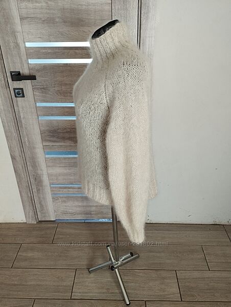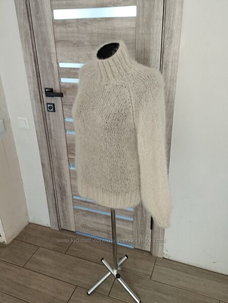 Светр зв´язаний з італійської пряжі, кидмохер шовк. Пряжа неймовірна з вишуканим блиском. Дуже м´яка, ніжна, ворс довгий, щільний, наче шубка. Розмір ширина 50 см, довжина 60 см. Колір виробник вказує місячне сяйво. Светр зв´язаний по колу, без швів, збоку невеликі розрізи. Не просвічує! Повноцінна річ, не павутинка.Можливий повтор в іншому кольорі і розмірі.