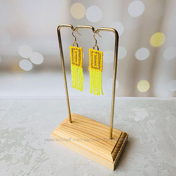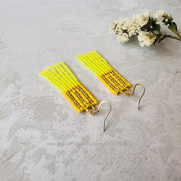 Яркие серьги из бисера с золотистым геометрическим узором и бахромой неоново-желтого цвета.Длина: 7 см
