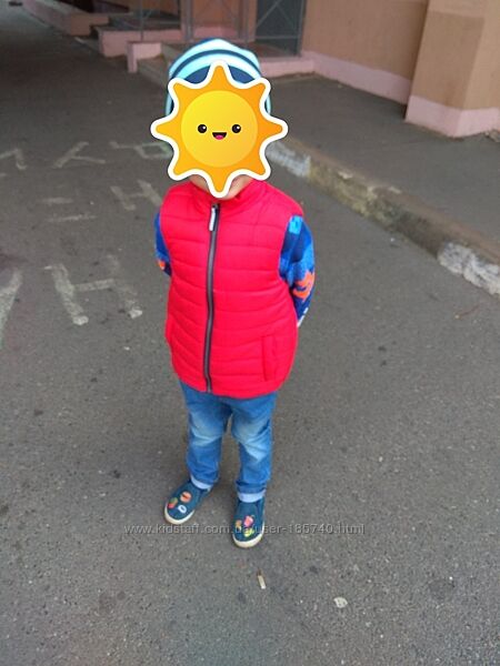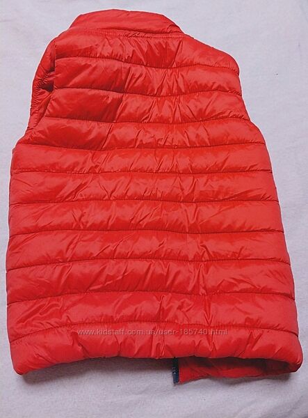 Тепла жилетка без капюшона з карманами. Розмір 116. Модель підійде і хлопчику і дівчинці, в мене носив хлопчик. Без недоліків. Легка, але дуже тепла. Підходить на осінь та весну., тоді коли куртку вдягати рано але вже дме вітер або прохолода. Без недоліківКолір червоний важко передати, фото вечірні дивіться на дитині.