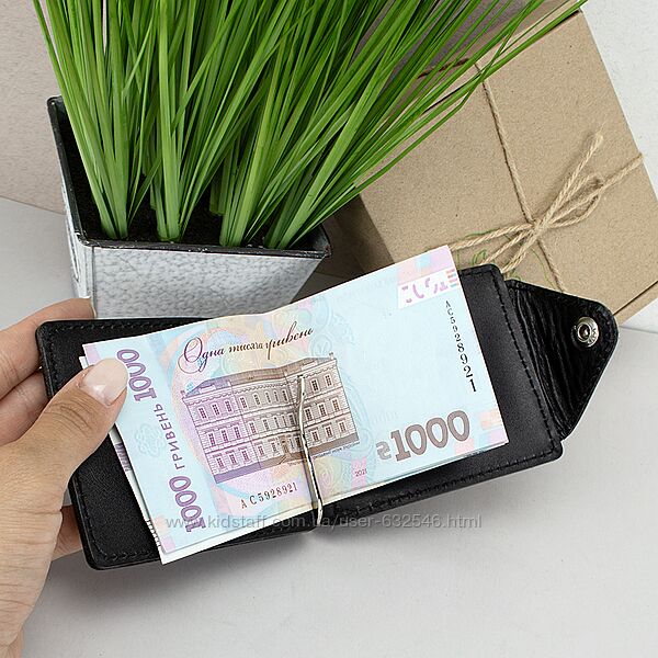 Колір фурнітури - нікель. Аксесуар акуратно прошитий міцною чорною ниткою. Подібні аксесуари дуже практичні та зручні. Їх можна носити в задній кишені ваших джинсів, при цьому вони залишатимуться непомітними. Тонкий затиск для грошей є відмінною альтернативою громіздкому гаманцю або портмоне, з яким будь-який чоловік почуватиметься впевнено та комфортно. Затиск застібається клапаном зі схованою кнопкою. Характеристики затиску: