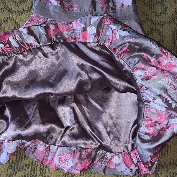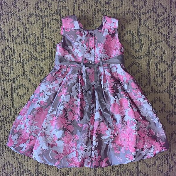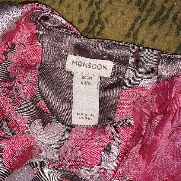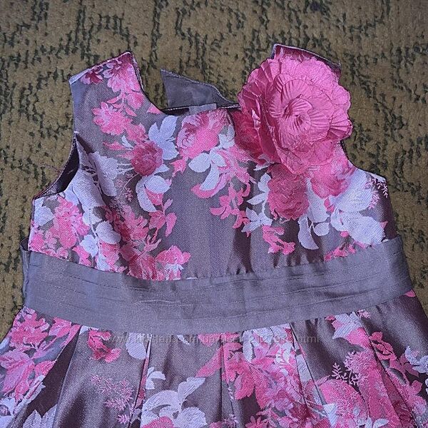 Monsoon. Дорога фірма. 18-24 міс. буде до 3-х років колір Мокко з яскраво - рожевими квітами. Яскрава сукня з королівського атласу з шикарним відливом і напиленням - квітковий принт. Пишне, спідниця- тюльпан. На плечику прикраса з шовковою квіткою.Довжина 60; пахви 31