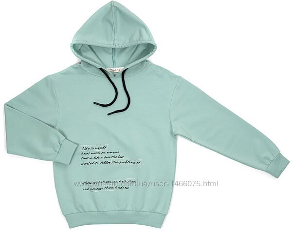 ● Худі прикрашений з переду акуратними дрібними принтовими написами чорного кольору та сріблястими стразами, штани - принтові написи кольору м´яти.