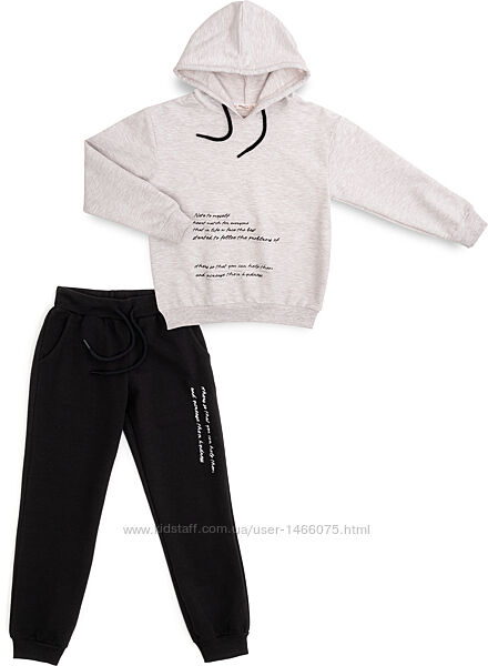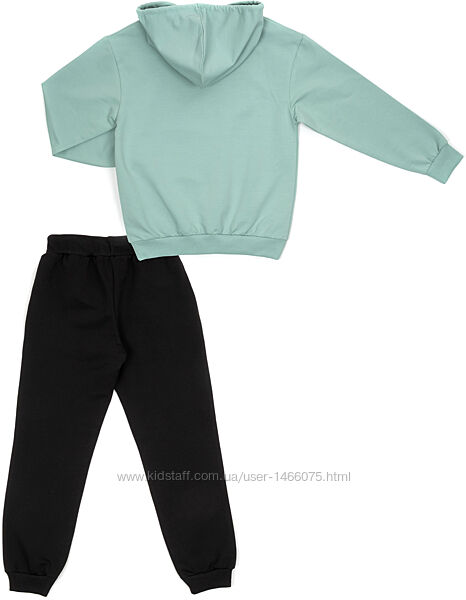 Стильний турецький трикотажний костюм для дівчинки.● Чудовий, двоколірний трикотажний костюм для дівчинки в стилі «спортивний шик»: худі, м´ятного кольору (та бежевого), і гладко-чорні штани на манжетах.