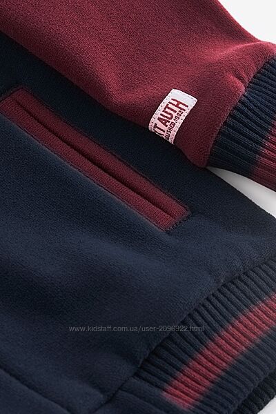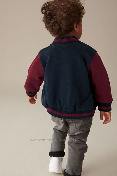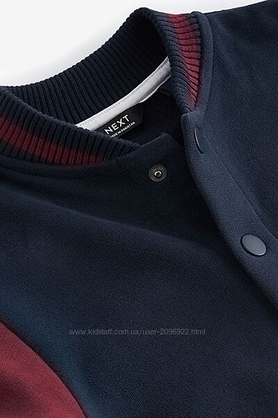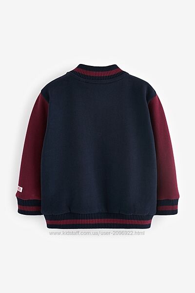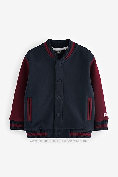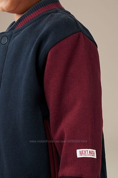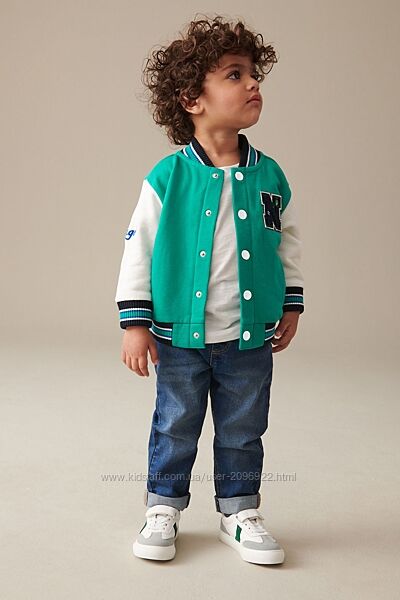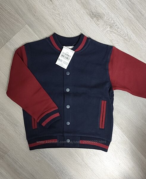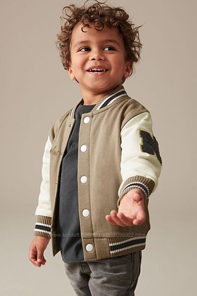 Бомбер з прихованими бічними кишенями, застібкою на ґудзиках і манжетами в рубчик. Вільна посадка, з аплікацією, кольоровими блоками.