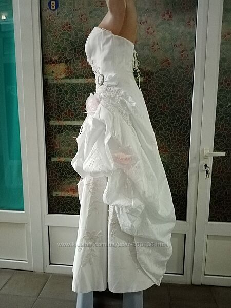 Б/В. Дуже красива та єфектна весільна сукня на розмір від 46 до 50. Розмір регулюється корсетною утяжкою, дивіться фото. Сукня має три слоя. Верхній йде на підкладці сіточка. Середній атласний. Третій чохол з підкладочної тканини. Спереду та по боках сукня оздобленна аплікаціями - квіти зі стразами. Корсет на кісточках.Заміри: