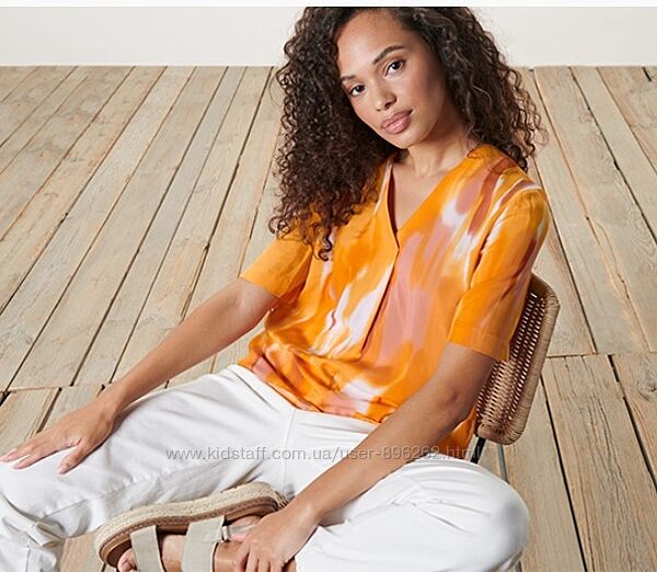 Блуза з аквареллю. М´яка якість, виготовлена з чистої віскози. З привабливим принтом. V-подібний виріз. Елегантна складка спереду. Приємна посадка. Перевірено на вміст шкідливих речовин – сторонніми акредитованими інститутами.