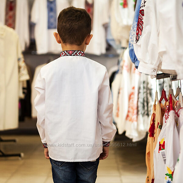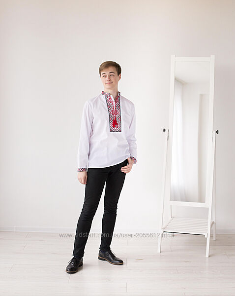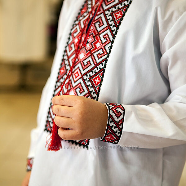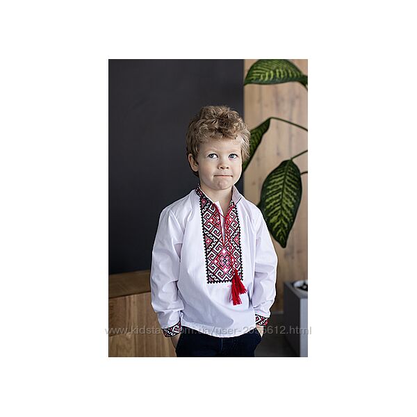 Вишита сорочка з довгим рукавом для хлопчика виготовлена з сорочкової тканини білого кольору. Прикрашена спереду, на комірі і на манжетах рукавів вишивкою хрестиком червоного кольору..Розміри 86, 98, 104, 152
