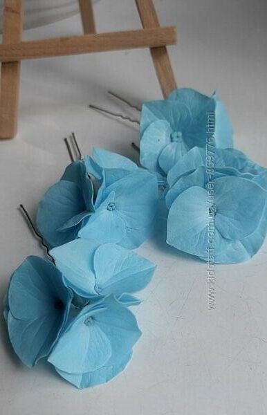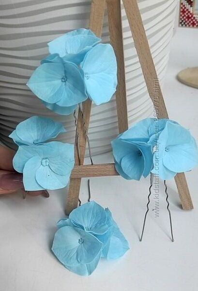 Квіткові шпильки стануть чудовим доповненням до костюма, сукні та настрою. Одна маленька деталь може кардинально змінити образ! Набір із 4 шпильок у зачіску з блакитиними гортензіями