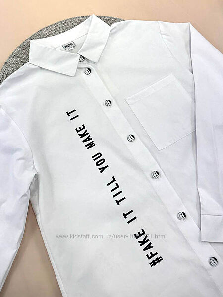 Стильна біла сорочка для дівчинки від української фабрики Mevis. Сорочка прямого крою, підійде дівчатам різної комплекції. Сорочка з лаконічними, але дуже стильними надписами. Бавовняна сорочка - ідеальна річ в гардеробі кожної дівчинки. Сорочку можна поєднувати як з брючками, так і з