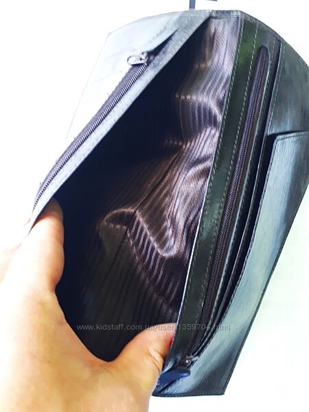 найвищої якості гладка глянцева шкіра ягня, темно-коричнового кольору. Німеччина. Новий.Натуральна тонка шкіра, якісна фурнітураВ:23 Ш:12, в розвернутому стані ширина 24