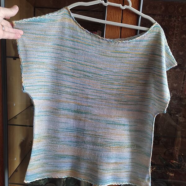 Продам женский вязанный летний топ ручной работы , горловина связанна "лодочкой " , рукава "спущеное плечо " , края обвязаны ложной косичкой . Размеры топа в лежачем положении : полуокружность груди - 44 см , от одного рукава до другого - 52 см , длина топа - 56 см , подойдёт на размеры 44-46 . Связан из итальянской пряжи : одна тоненькая ниточка полушести ( 30 % ) + 2 ниточки секционной натуральной вискозы . К телу топ очень приятный , тонкий , мягкий . Фото цвет топа плохо передается , ближе цвет передался на первом фото . Цена 500 грн .Другие объявления продавца