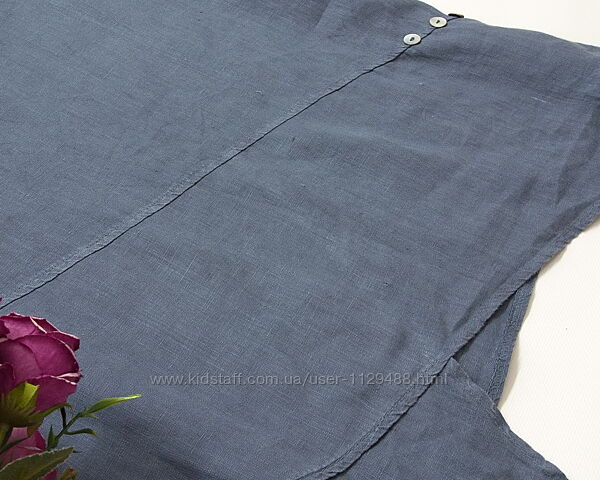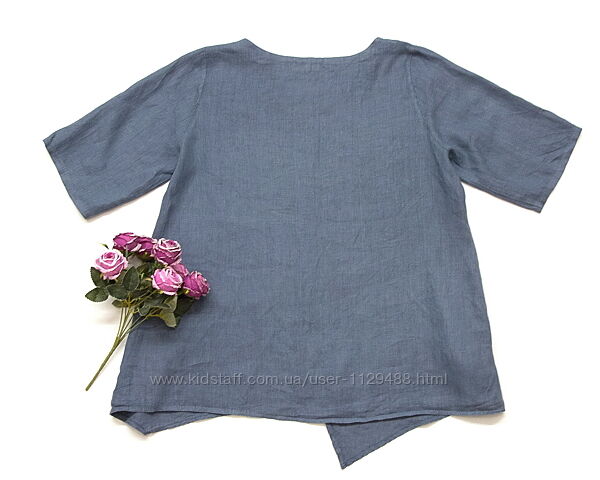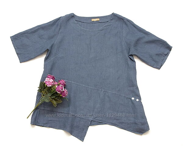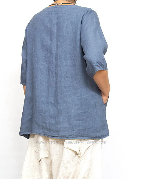Оригинальная, крой свободный, низ асимметричный, есть карман, декорирована пуговками из натурального перламутра. Выполнена из натуральной дышащей ткани, не жаркая, очень приятная к телу. Цвет нейтральный, приглушенно-голубой, легко сочетается с любым низом, служит отличным фоном для всевозможных аксессуаров.
