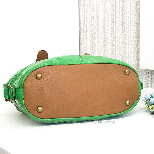 Большая, заметная, очень вместительная. Выполнена из мясистой мягкой текстурной натуральной кожи отличного качества. Основной тон насыщенный сочный зеленый, донце и ручки светло-коричневого цвета. Закрывается на молнию, внутри одно отделение, в нем карман на молнии и открытый кожаный карман. Донце плотное, подкладка из плотного хлопка.