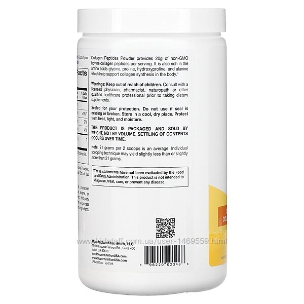 Пептиди колагену в порошку від Super Nutrition® містять 20 г пептидів колагену без ГМО з великої рогатої худоби в кожній порції. Вони також містять амінокислоти гліцин, пролін, гідроксипролін і аланін, які допомагають підтримувати синтез колагену в організмі*.