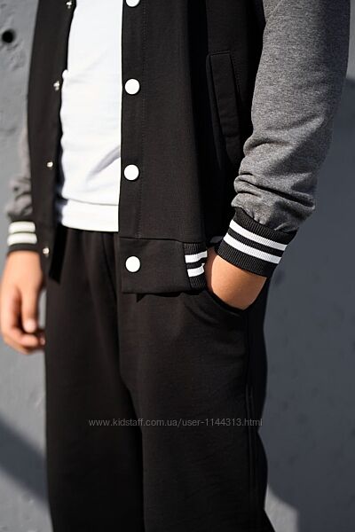 Комплект з бомбера на кнопках та джогерів з двуниткиБомбер прямого крою на кнопках, горловина з рібани, є бічні кишені, опущене плече, на манжетах та по низу рібана, якісний принт по переду на рівні грудей