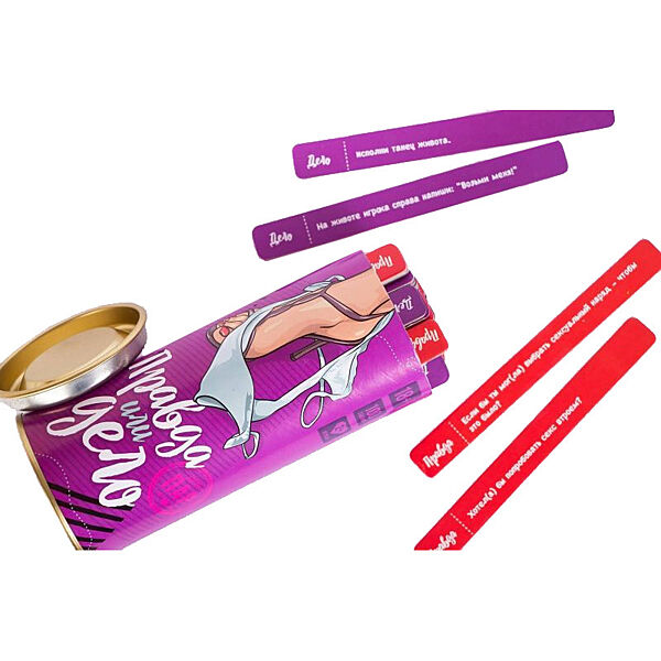 Стильна коробка зберігає в собі 50 картонних стиків, де є 2 категоріями. Учасники по черзі роблять хід: правда чи справа, картки «Правда» потрібно витягувати червоною стороною, а «Діло» фіолетовий. Заборонено вибирати одне завдання кілька разів, так само якщо випав пікантний сюжет можна відмовитися від нього тільки один раз. Головне правило — не соромитися, розслабитися й отримувати задоволення.