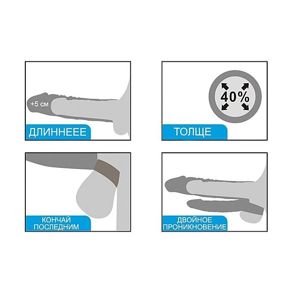 Вашому партнерові сподобається більш глибоке проникнення завдяки подовженню на 5 см. Насадка дуже еластична, підходить для більшості розмірів, досить щільна, СВЕРХМЯГКАЯ тканину відчувається як друга шкіра - тільки краще!