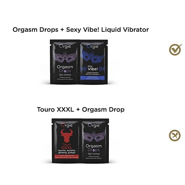 Набір тестерів продукції OrgieІгровий набір є комбінацією з 4 бестселерів Orgie у форматі саші по 2 мл, розроблену для того, щоб стати ідеальним вибором для романтичного відпочинку, приємного невеликого подарунка або для того, щоб спробувати ці продукти Orgie. Є один продукт для неї, один для нього, один для пар та один для прелюдії.