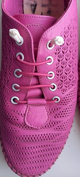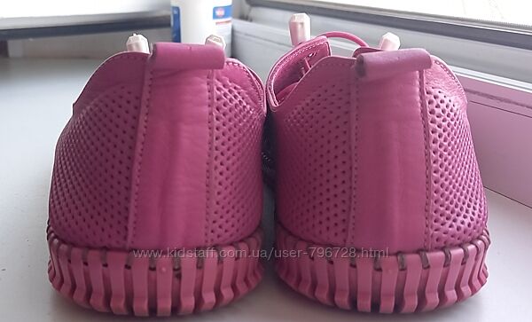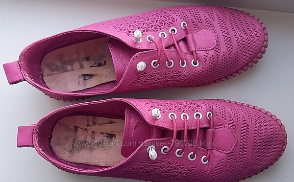 Продам яркие розовые перфорированные мокасины на резиновой подошве. Натуральная кожа. Размер 38, по стельке 24 см. Состояние отличное, ношены несколько раз. Без нюансов, единственное, что вытаскивали стельки, которые были приклеены, но сами стельки в порядке. Шнуровка - резинки. Мягкие. Производство Турция.Без возврата.