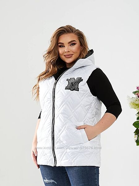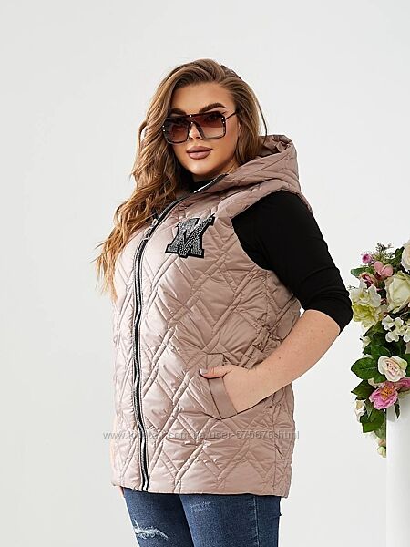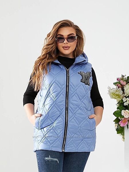 Стильна стегана жилетка прямого крою з кишенями, зручний глибокий капюшон, декорована нашивкою в камінні, якісна фурнітура.