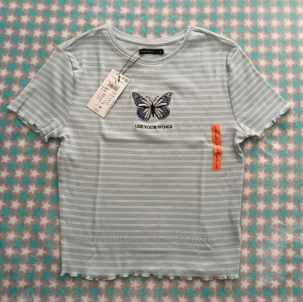 Колір: блакитні та білі смужки з вишитою аплікацєю «Метелик».