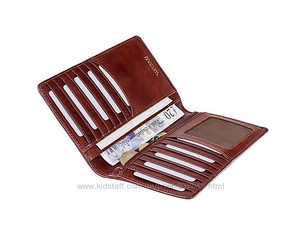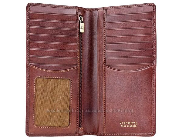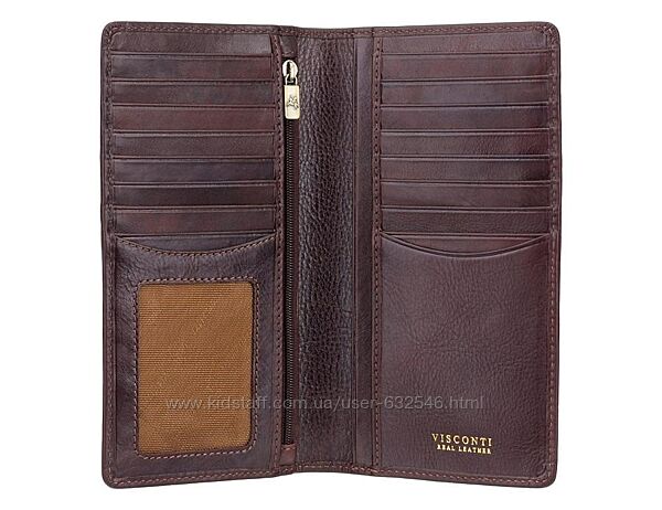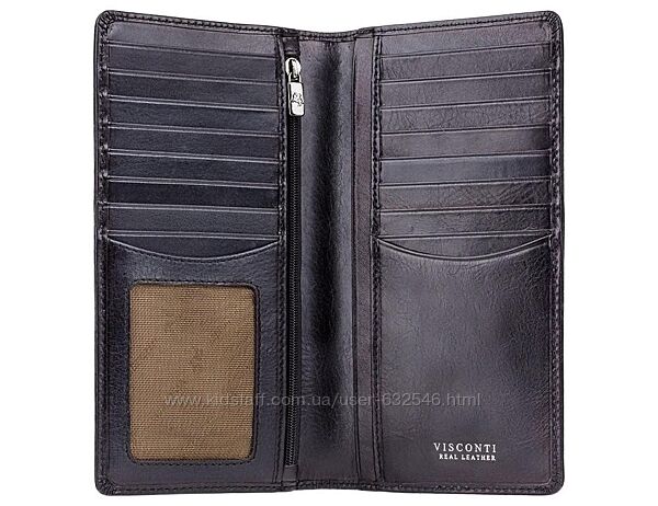 Матеріал: Натуральна шкіра Розмір: (Ширина 10 см) х (Висота 18.5 см) х (Товщина 2.2 см) 4 глибокі кишені для купюр; Відділення для купюр на блискавці; Віконце для фото-посвідчення; 16 відділень для карток; Усі підкладки виконані із міцної тканини, брендованої логотипом Visconti; Вага: 128 грам; Захист від зчитування RFID-чіпів; Поставляється у фірмовій міцній подарунковій коробці; Виробляється у Великій Британії.