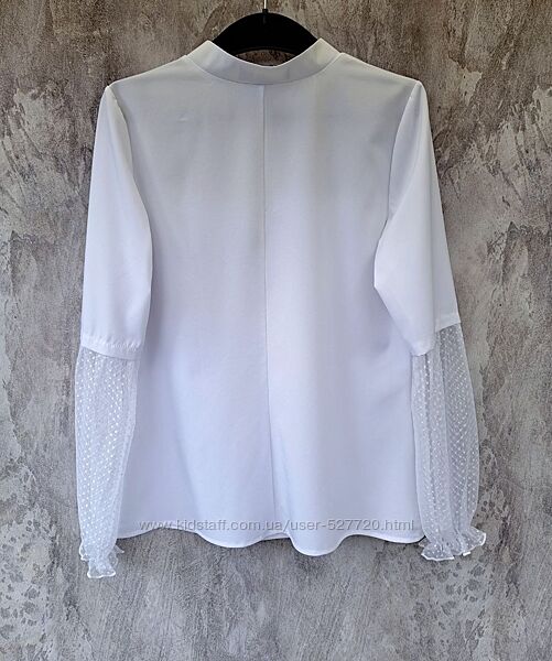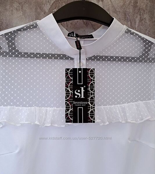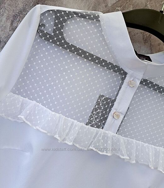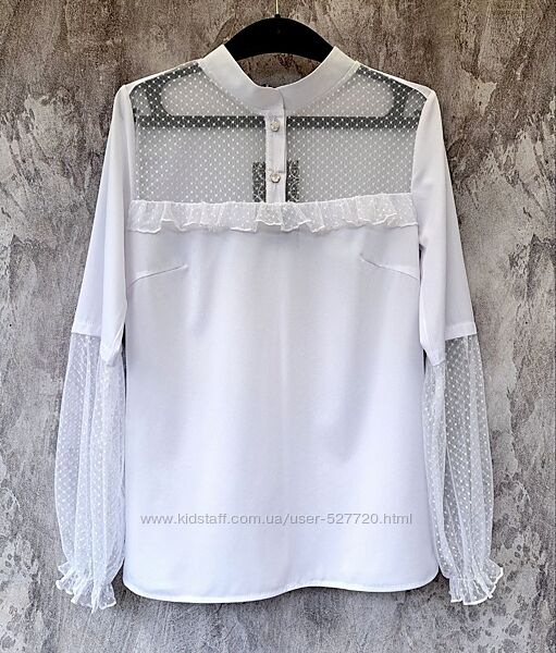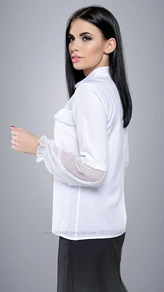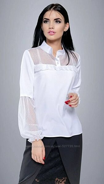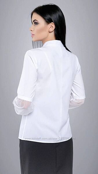 НАЛИЧИЕ ПО РАЗМЕРАМ УТОЧНЯЙТЕ ПОЖАЛУЙСТАЖенская блузка выполнена их комбинированных материалов. Воротник-стойка, спереди небольшая планка, застегивается на 2 пуговицы. Кокетка с рюшами и нижняя часть рукавов выполнены из сетки в горошек.