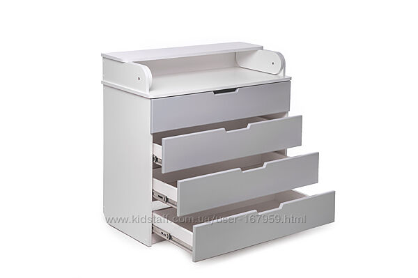 Дитячий KOMOD – ідеальне рішення цього питання. Він не займає багато простору та характеризується чудовою місткістю. В його чотирьох ящиках знайдеться місце для всього необхідного. Верхня частина комоду легко відкидається та перетворюється в зручний пеленальний столик, який за необхідності знімається. А заокруглені бортики дозволять безпечно переодягнути малюка.