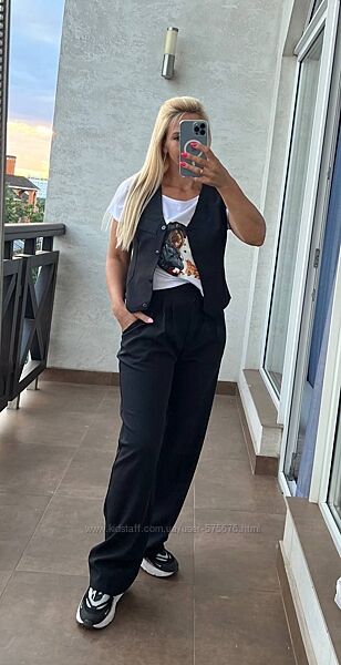 Матеріал: костюмний креп.. Штани з високою посадкою. Довжина 108/78см. Пояс штанів на талії спереду рівний, ззаду злегка призбираний на резинці, шириною 5 см, що дає ідеальну посадку. Застібка - блискавка та гудзик. Жилетка застібається на гудзики. Її можна носити без блузи (тренд цього сезону). А також комбінувати з боді чи блузкою. Створюючи різні образи.