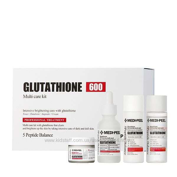 Набір засобів для освітлення та вирівнювання тону обличчя Medi-Peel Glutathione 600 Multi Care Kit призначений для дбайливого освітлення шкіри, боротьби з нерівним тьмяним тоном і нездоровим кольором обличчя, пігментацією й почервонінню.Відмітна особливість лінії полягає в її здатності діяти на шкіру не тільки зовні, але й зсередини. Вона допомагає знизити вироблення меланіну, завдяки чому поступово зникають уже наявні пігментні плями й уповільнюється утворення нових, вирівнюється тон, освітлюється шкіра, проходить почервоніння, повертається свіжість і сяйво.
