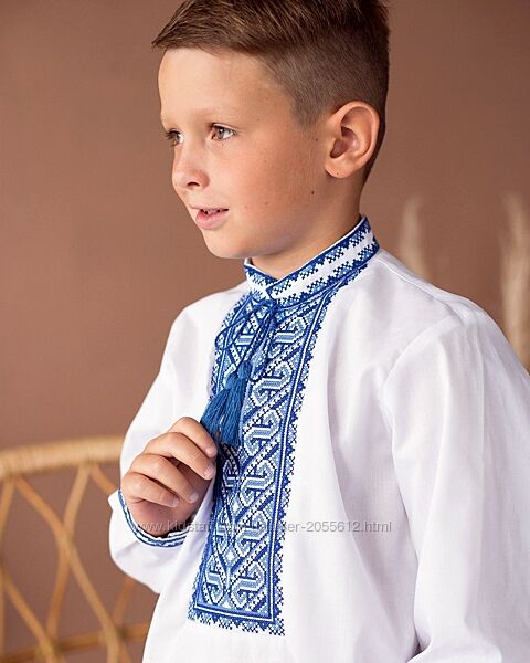 Вишиванка з довгим рукавом для хлопчика виготовлена з сорочкової тканини білого кольору. Прикрашена спереду, на комірі і на манжетах рукавів оригінальною вишивкою хрестиком синього кольору.Розміри 86, 92, 98, 104, 122, 128, 140, 146, 152