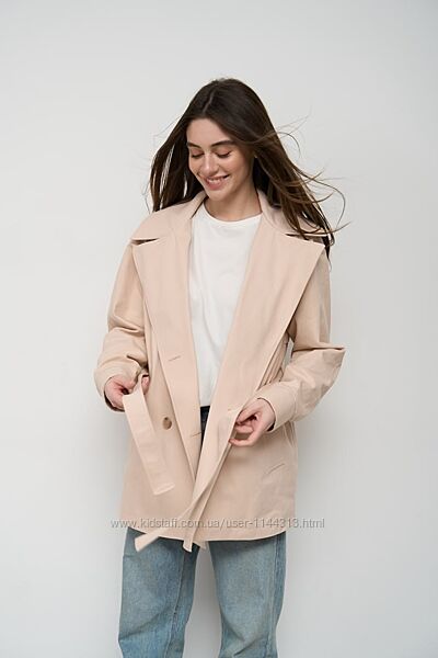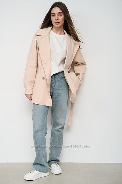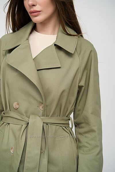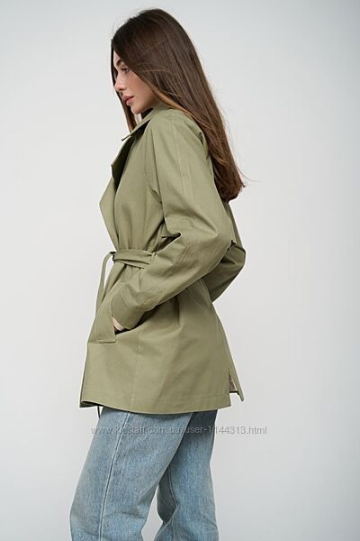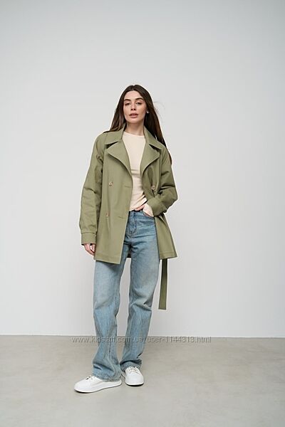 Легкий укорочений тренч з котону вільного крою, чудовий тренч для повсякденних образів та стильних поєднань.Тренч двобортний на запах, укорочений з пояском, рукава регламентні з елементами пати на ґудзиках, є глибокі бічні кишені, плече йде від горловини, широкий комір та відлітна кокетка по периметру зверху, по заду є шліца