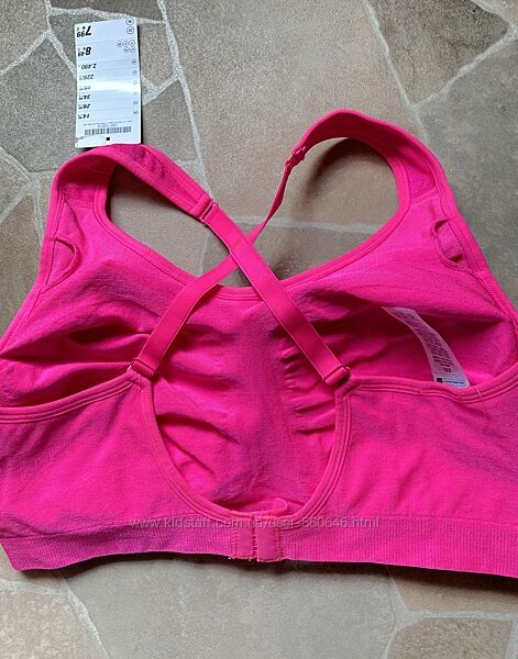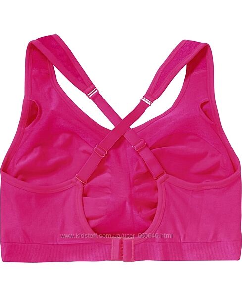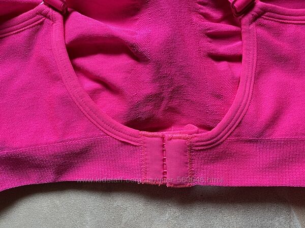Відмінна якість! Красивий, яскравий спортивний топ-бюстгальтер . Безшовний, зональний,еластичний, приємний до тіла. М´яка подвійна тканина. Склад: 94 % поліамід, 6 % еластан. Широка гумка під грудьми. Бретелі регулюються і відстібаються. Чашечки виймаються. Застібка на 3 положення. Вказаний розмір 2XL, ОБОВ´ЯЗКО дивіться виміри в спокійному стані: напівОГ 42, напівобьєм під грудьми 36 (розтягується до 46-47 см), висота ~34, висота бокового шва 14 ,висота між грудьми 18 см. Без недоліків. Колір красивий яскраво-рожевий.