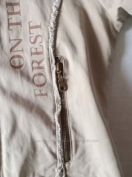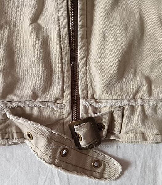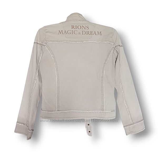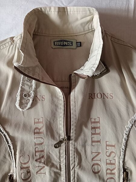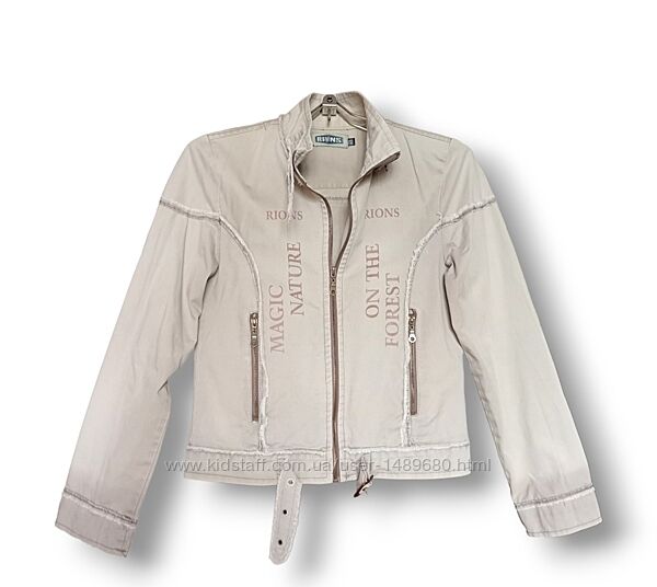 Стильна вкорочена куртка з цупкої бавовни від RIONS. Фабрично не оброблені шви, без підклаки,стильний принт. Застібка блискавка.Колір колір сіро-бежевий, має фабрично вибіленні шви.