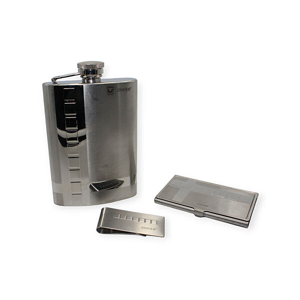 Подробное описание: Мужской подарочный набор Zinger стильная фляга, визитница и зажим для купюр Некондиция